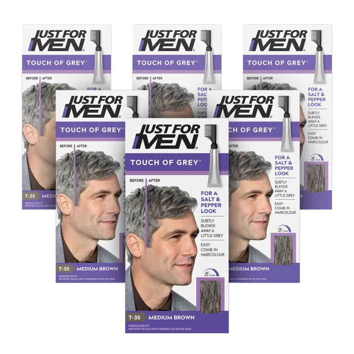 Just For Men Touch of Grey Hair Dye Medium Brown T-35 6 Pack allows you to still have that touch of grey to your hair, but not so much that it covers your vitality. Touch of Grey is incredibly easy to use and allows you to decide how much or how little grey you want to keep. It is available in all hair shades and the ammonia and peroxide-free formula conditions your hair, so that it is left looking completely natural and in great condition. With no mixing, there?s no mess and the process takes just 5 minutes!
