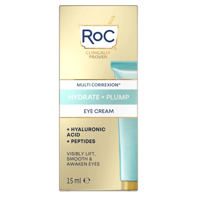 RoC Multi Correxion Hydrate & Plump Eye Cream provides a complete age-defying eye recovery! This gel-cream visibly lifts, smooths, and awakens eyes. It has been specially formulated to target the delicate eye area. Hyaluronic Acid instantly re-plumps lines and wrinkles while Peptides visibly lift and firm the eye contour. Added Caffeine awakens and alleviates the appearance of eye bags and puffiness. See the power of 3 age-defying results in 1 eye cream. After 72 hours the eye area is deeply hydrated and after 2 weeks crow’s feet, fine lines, and wrinkles are visibly reduced. After 4 weeks, the eye contour is visibly lifted and firmed.
