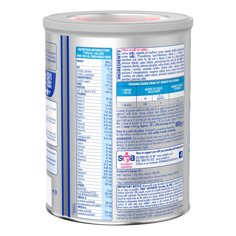 SMA Advanced Growing Up Milk is enriched with essential nutrients to support a young child’s growth until they turn 4. Made with Zinc and Vitamins A, C & D to support the normal function of the immune system and Omega 3 & 6 and Iodine support normal growth. It also contains 2’FL and LNnT.