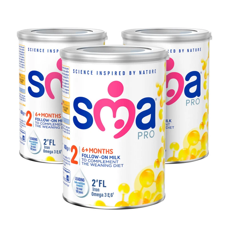 SMA PRO Follow On Milk is enriched with essential nutrients to support 3 main areas at this stage in your baby’s development: development, immunity and growth. Iron supports normal cognitive development, Vitamins A, C & D support normal function of the immune system, Vitamin D and Calcium support normal growth and development of bones, and Omega 3 & 6 helps to support normal growth.