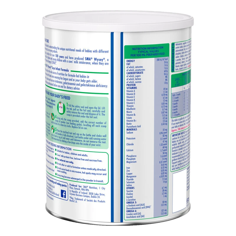 SMA Wysoy Formula is a nutritionally complete soya formula for the dietary management of cows’ milk intolerance. It is suitable for use for milk protein intolerance, lactose and sucrose intolerance, galactosaemia and galactokinase deficiency. This formula can be used as the sole source of nutrition from birth and can be mixed with foods during weaning.