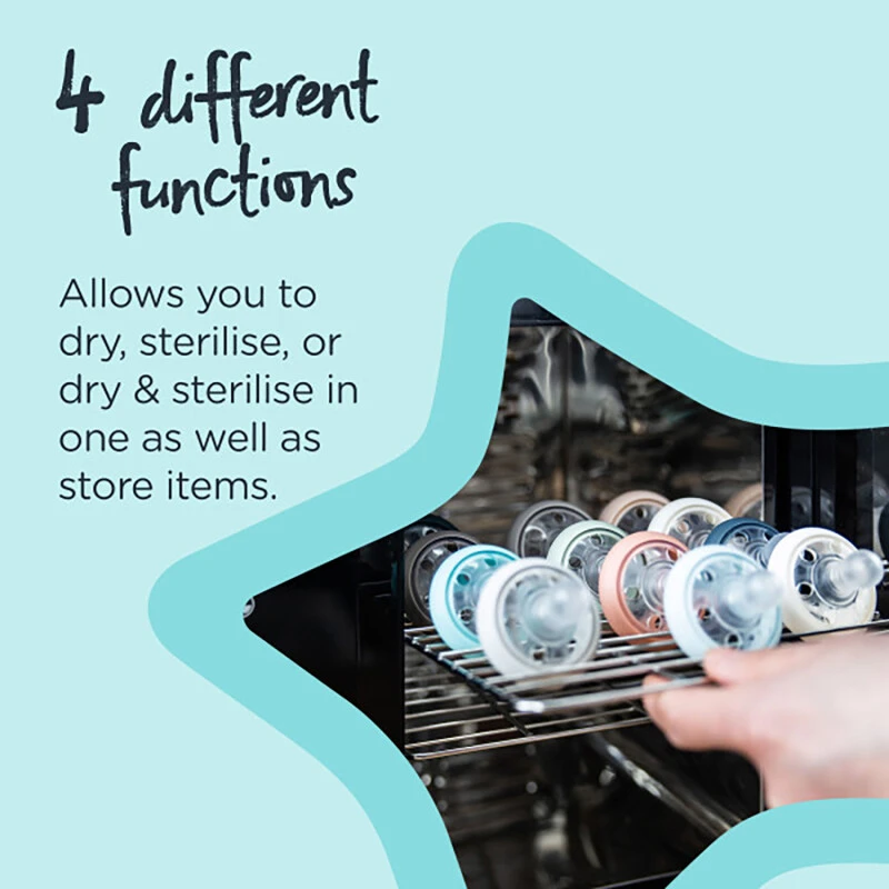 - The steriliser unit features a replaceable and washable filter which helps keep dust and dirt particles out of the air used to dry your bottles and feeding accessories, so they stay clean once sterilised.